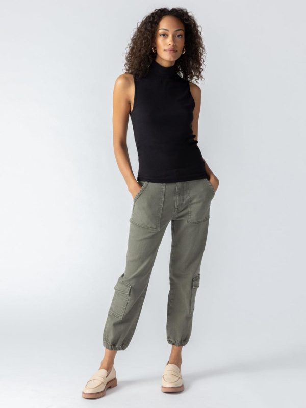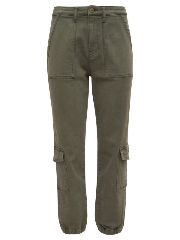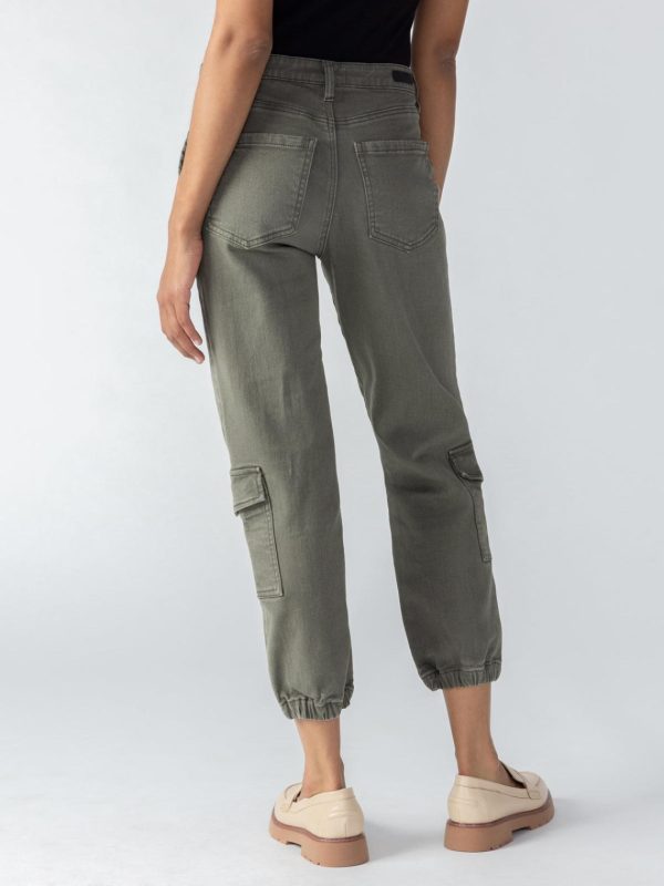 Semi-high rise, medium weight, relaxed cargo with a tapered leg and an elastic hem.